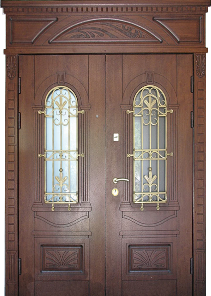 Поскольку в большинстве случаев устанавливаемые на входе в коттедж двустворчатые двери являются еще и предметом интерьера, украшающим здание, их дизайну предается особое значение. Эти двери, как правило, отделываются атмосферостойким МДФ, натуральным шпоном, массивом. Эффектно на таких дверях смотрится витражный узор, применение ковки, зеркальных элементов. Вариантов декора входной двустворчатой двери масса, тут все зависит от пожеланий заказчика.